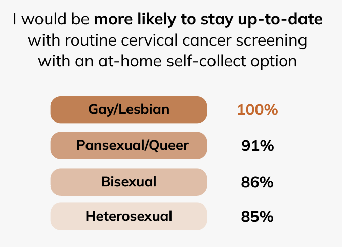 - Over 89% of those who identified as gay, lesbian, pansexual, bisexual, or queer indicated they would be more likely to stay up-to-date on screenings with at-home self-collection, like the Teal Wand.